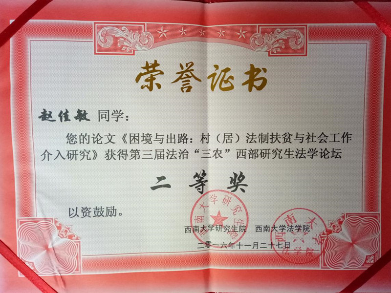 2016年11月26日,法学院2015级法律硕士赵佳敏应邀参加第三届法治“三农”西部研究生法学论坛,由她提交的会议论文《困境与出路:村(居)法制扶贫与社会工作介入研究》在专家评审中脱颖而出,荣获二等奖。