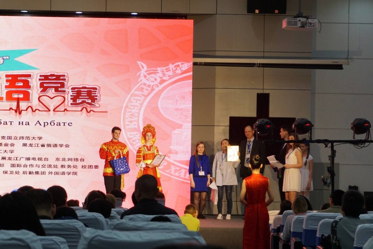 本次竞赛设置俄语朗诵、俄语歌曲、俄罗斯舞蹈、俄罗斯戏剧四个比赛单元。我校选手参加了俄语歌曲、俄语朗诵竞赛。经过3天的激烈比赛,15级宋佳欣同学俄语歌曲«Солнце»(太阳),以高超的演唱技巧、纯正的俄语发音获第四名的好成绩;16级白洁同学«Жди меня»(等着我吧)诗篇朗诵声情并茂,感染了在场的每一位听众,两位同学良好的专业素质和精神风貌受到大赛评委会的一致认可。最终,学校获得俄语歌曲竞赛三等奖(一等奖1所,二等奖2所,三等奖3所),李亚林、吴素珍老师获得优秀指导教师奖。